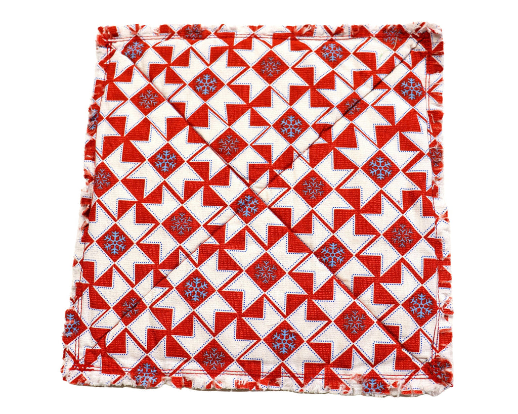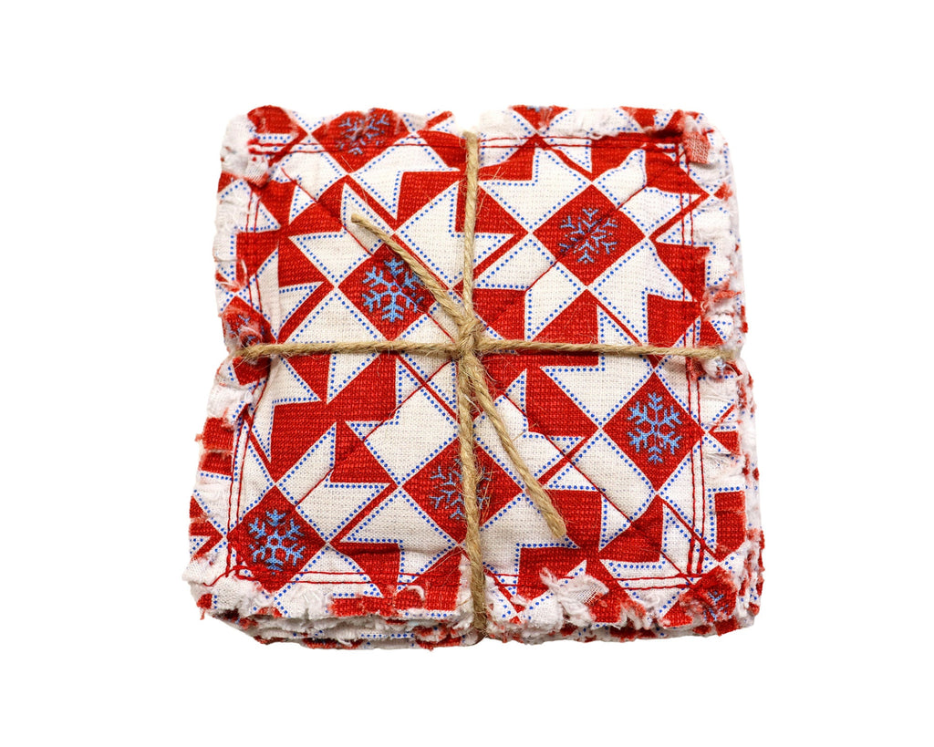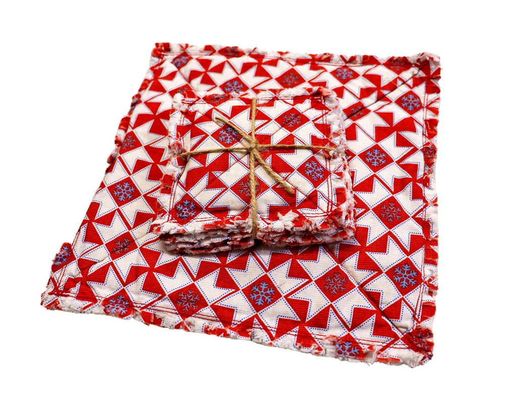 Christmas Rag Quilt Coaster Set: Red Snowflake Holiday Decor