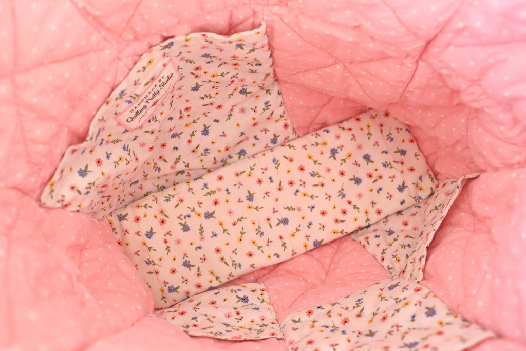 This fun rag quilt tote is made with pretty floral patchwork fabric on the outside and a dainty pink pin dot lining. This lovely tote will be such a thoughtful gift for your mom, sister, or friend.