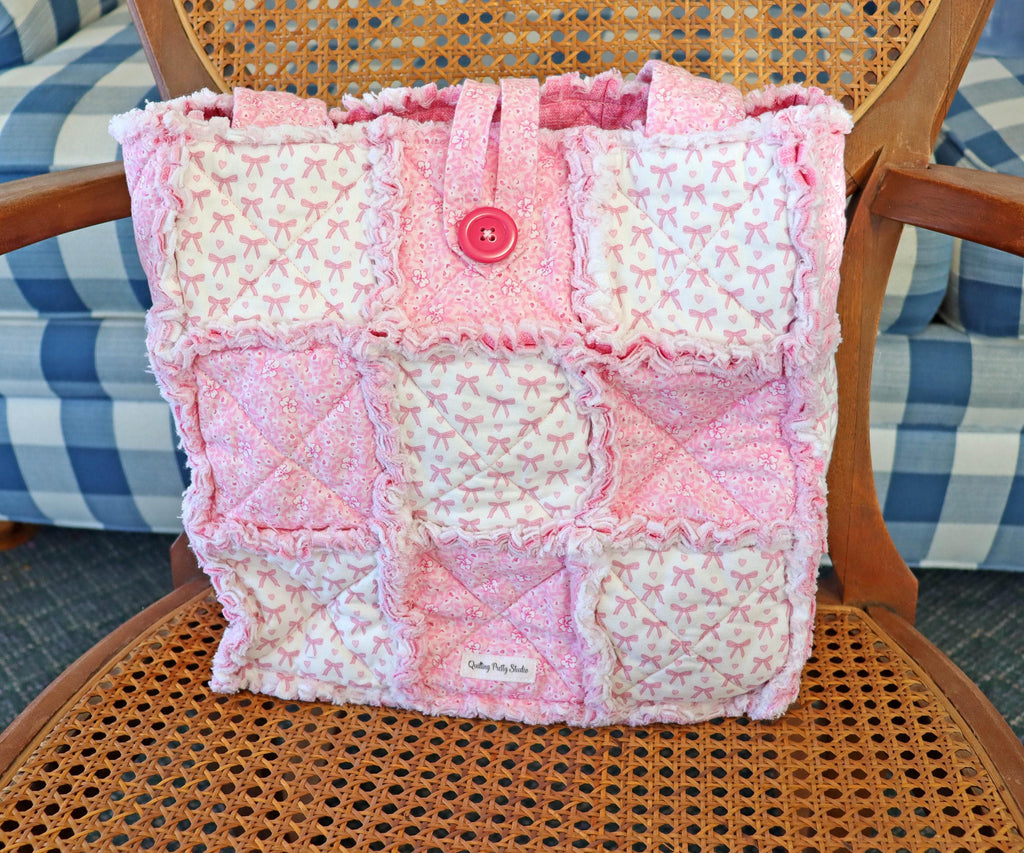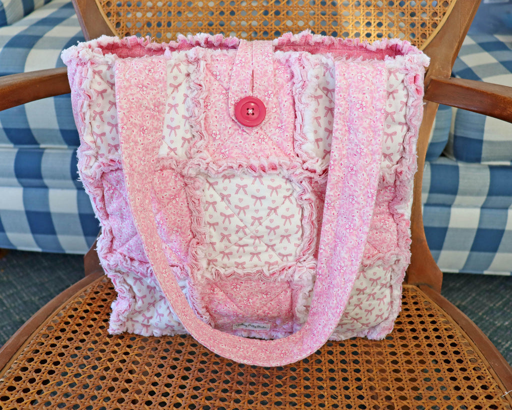 This pretty rag quilt tote is made with cute and trendy pink bow and floral fabrics. This cute tote will be such a thoughtful gift for your mom, sister, or friend.