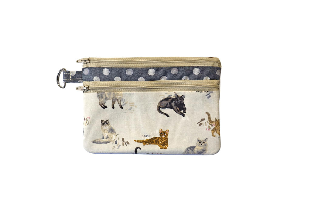 Both the small and large double zipper bags are made with fun cat print fabric. There are two zipper compartments in each bag.