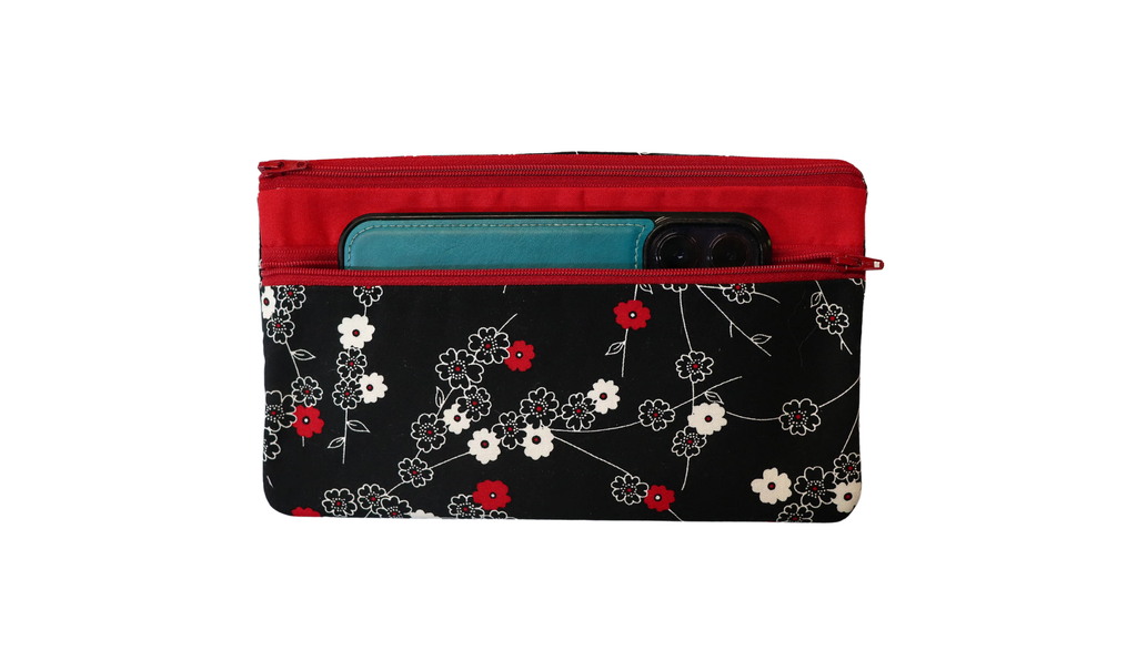 Large double zipper bag is made with pretty red and black floral and red solid fabrics. There are two zipper compartments.