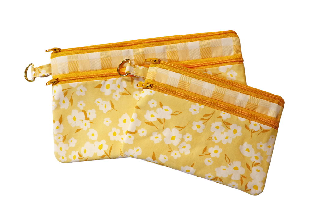 Both the small and large double zipper bags are made with a beautiful yellow floral and complementary yellow check fabric. There are two zipper compartments in each bag. A fabric loop and d-ring have been added for your keys, charms, or a wristlet.